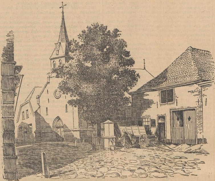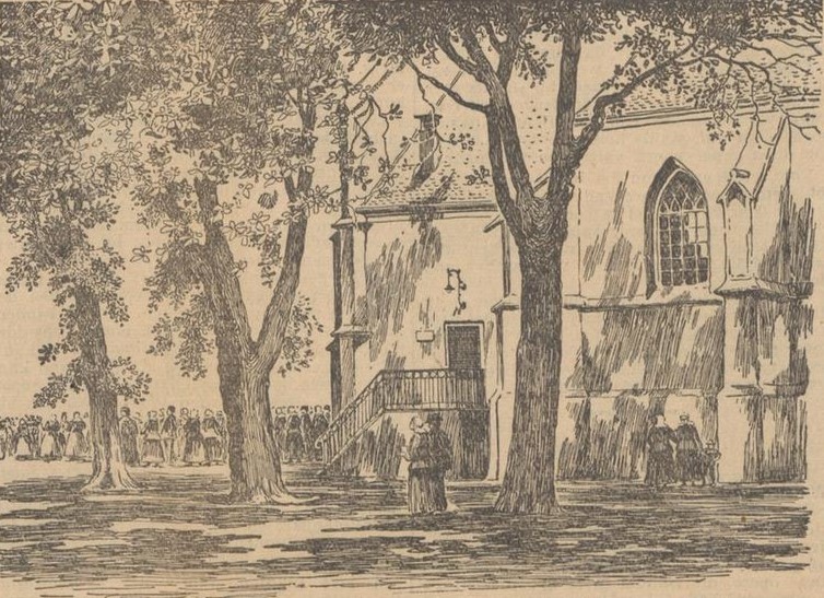 Het prachtige plein, met de oude boomen, en de nog veel oudere kerk, biedt, vooral op Zondagen, een gezellige drukte. Want wie uit de kerk komt, gaat niet direct naar huis; er zijn dan zooveel boeren die uit de verre buurtschappen komen, en die wil men dan wel eens spreken over het één en ander. Vroeger namen de boeren die van verre kwamen ook hun kruidenierswaren en wat er verder op de buurt niet te krijgen was, uit het stadje mee naar huis. Het paard en de wagen werden dan tijdens den kerkdienst bij smid, timmerman, grossier in meststoffen, of een bekende familie gestald. Men had daar dan meteen zijn „angank”, hetgeen wil zeggen, dat men daar zijn kerkboek liet tot de volgende week en dat men er na afloop van den kerkdienst eerst een „kupken koffie” dronk vóór de reis huiswaarts werd ondernomen.