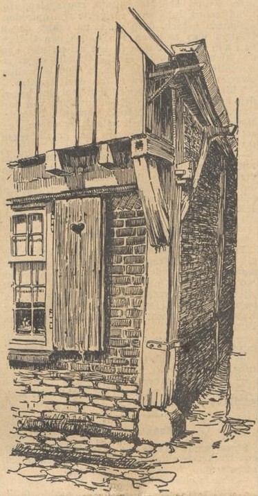 Aan de bouwerij doet hij niet veel. Alleen voor eigen gebruik. Toch heeft alles den schijn, dat het boerenbedrijf nummer één is en de rest bijzaak. Tusschen de keuken, tevens kamer, die men op het meesterwerk van onzen teekenaar door de open deur achterin ziet, en het kleine kleermakerskamertje vooraan, komt men door de opening links achteraan, in een donkeren stal, waar hoogstens vier koeien kunnen staan. ’s Zomers zijn die natuurlijk in de weide.
