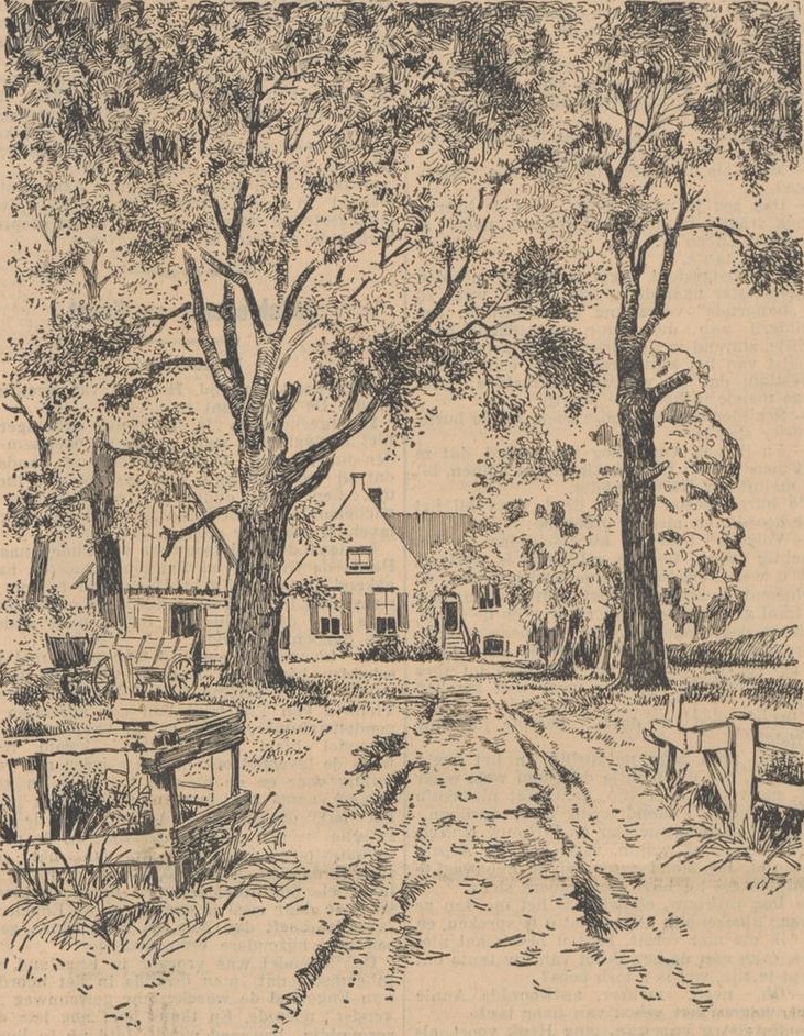 — Het is daar gemengd bedrijf. redeneerde onze artiest onbewogen voort. Land-tuinbouw, en vee. Voor de weinige koeien, die een boer noodzakelijk moet houden, als mest voor het steeds schrale land, is de ruim gehouden zolder van voldoende grootte om het hooi te bergen. Ook de roggeoogst moet op den zolder een plaatsje vinden, daar het dorschen een winterwerkje is.