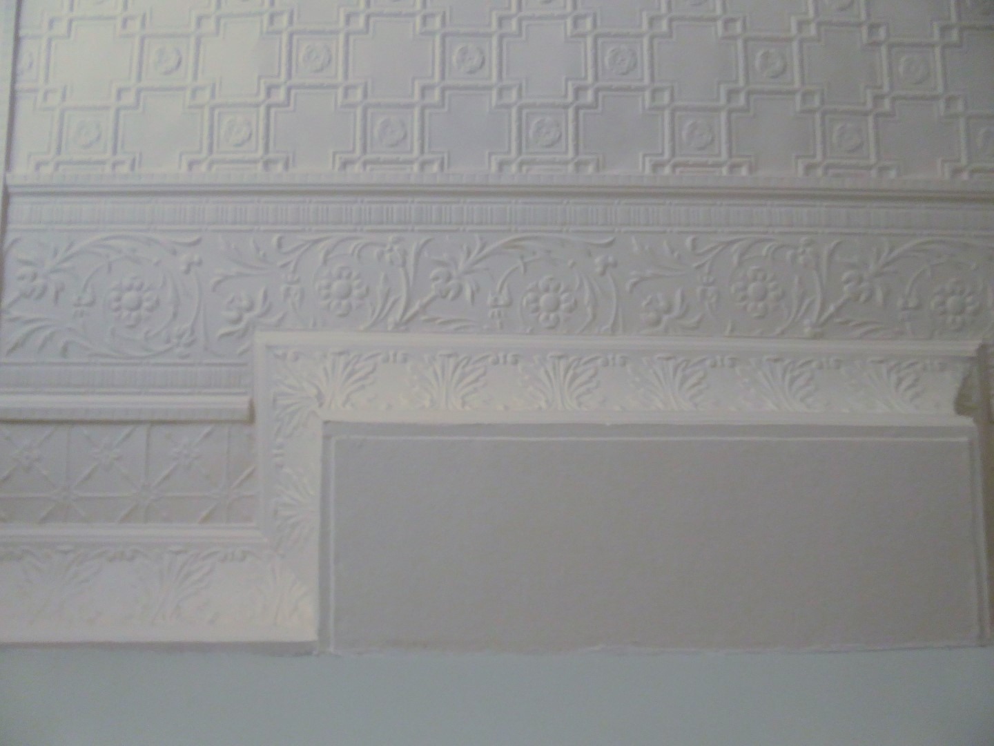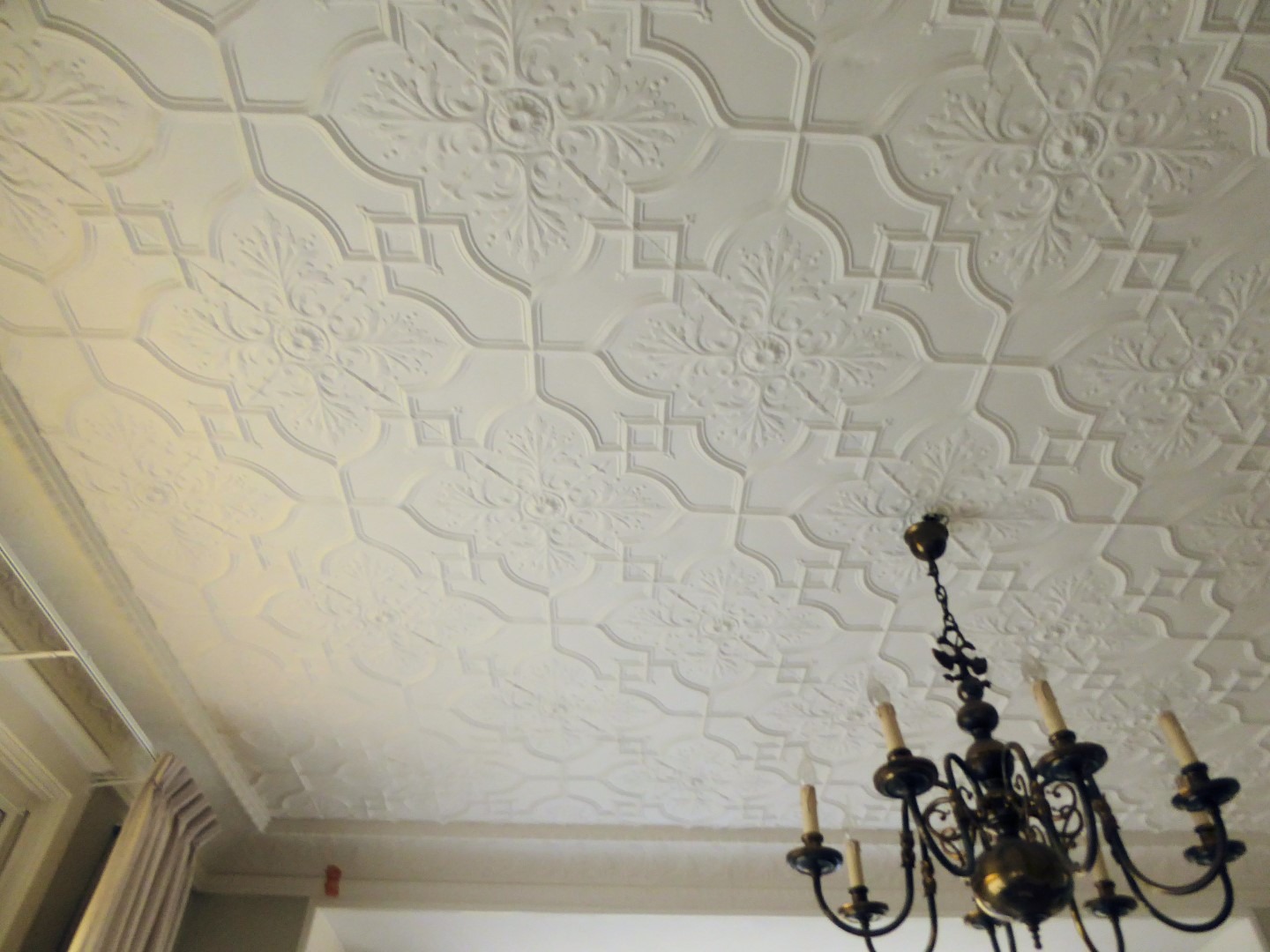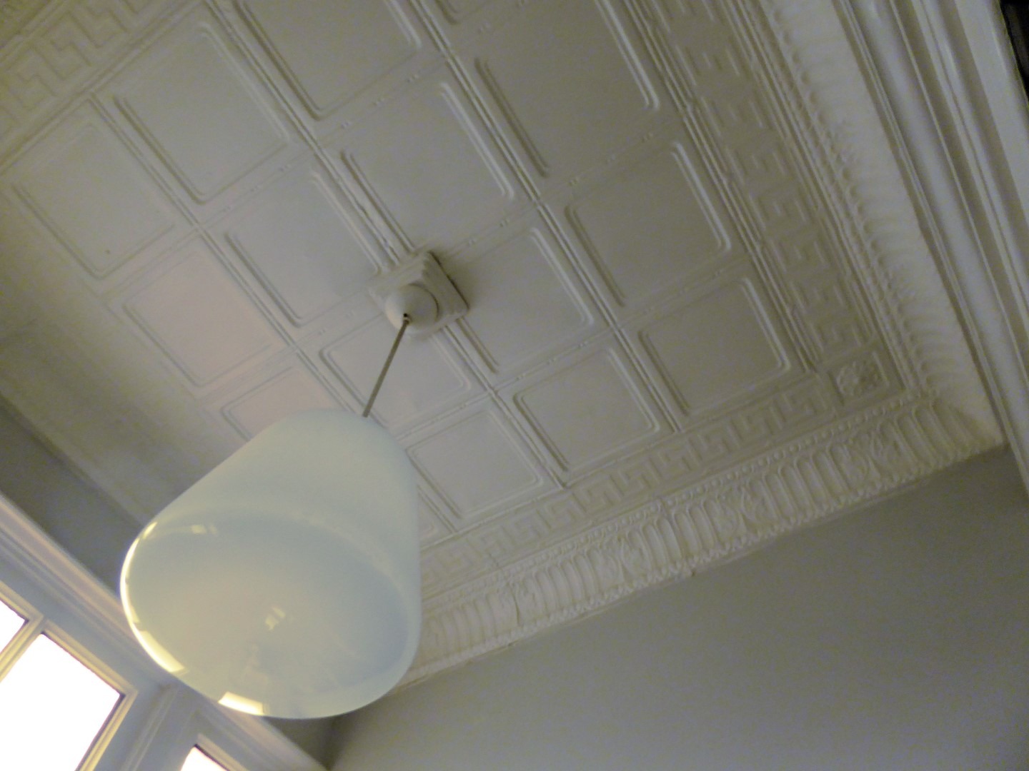 Een opvallend detail van dit pand is de aanwezigheid van zogenaamde ‘blikken plafonds‘. Blikken plafonds zijn afgewerkt met blikken cassettes (panelen) waar decoratieve patronen in zijn geperst. Dit fenomeen waaide begin vorige eeuw over vanuit Amerika en was sneller en goedkoper dan het traditionele sierstucwerk dat doorgaans in dit soort huizen werd aangetroffen.