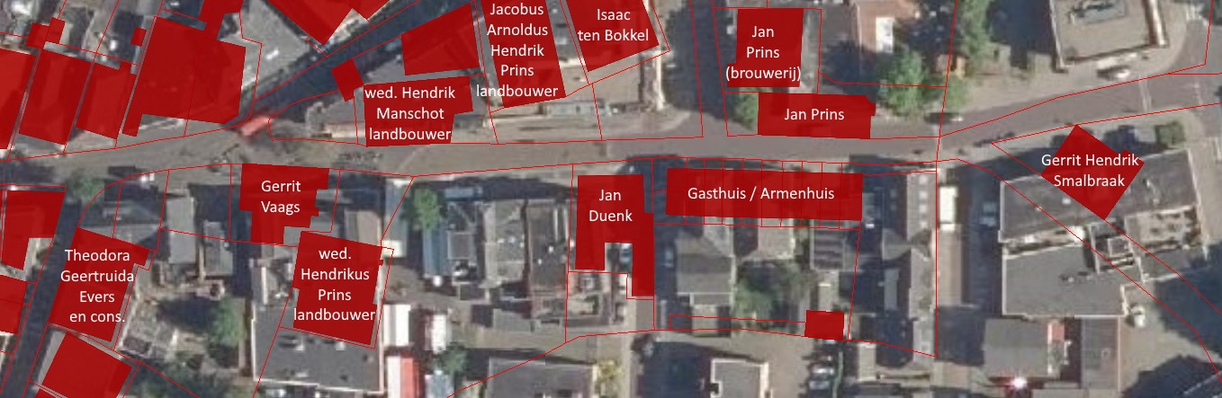 Op de onderstaande foto links zien we de Haartsestraat rond 1900. Linksvoor zien we nog een stukje van het Stiemenshuus. Aan de rechterkant, voorbij de burgemeesterswoning – het latere postkantoor – zien we het Gasthuis. Helemaal achteraan zien we ook nog net het Luutenshuus.