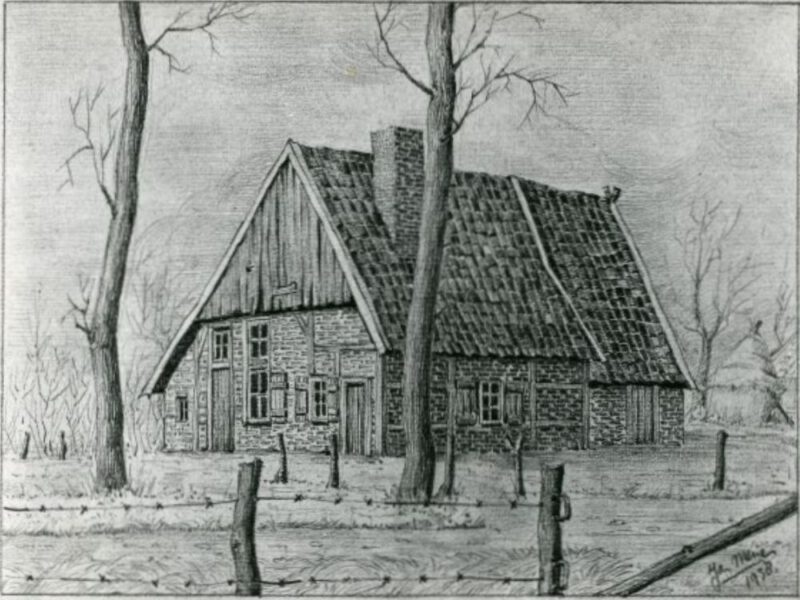 Bovenstaande tekening van Jan Meinen uit 1938 stelt de in de 2e helft van de 18e eeuw gebouwde boerderij “Huuskesmanus” voor. De boerderij heeft een hoge vakwerkzijgevel ‘miete’ (hooimijt) achter het hallehuis. Deze boerderij zou in de buurt van Bredevoort staan of hebben gestaan.