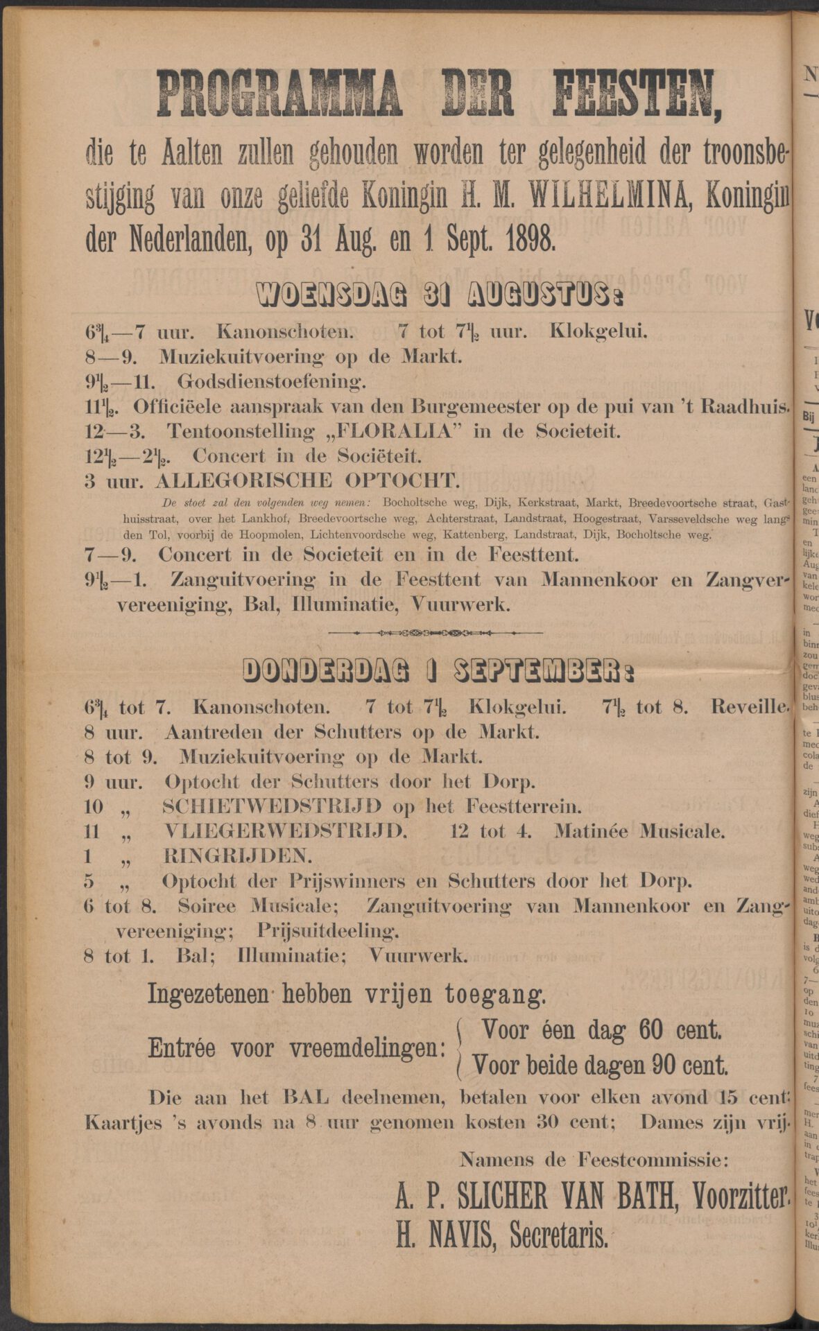 Wij schrijven Woensdagavond 5 Januari 1898: vergadering van het comité voor de viering van het Kroningsfeest in de Sociëteit op het Blik. Ons nummer van den 8en Januari 1898 geeft daarvan het volgende verslag: