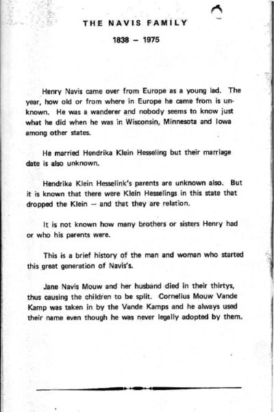 Between 1982 and 1983, the mystery surrounding the ancestry of Henry Navis and his wife Hendrika Kleinhesselink was solved by genealogical research and communicated to the descendants in America. They were thrilled that after so many years there had been clarity about the origins of their founders in the US.