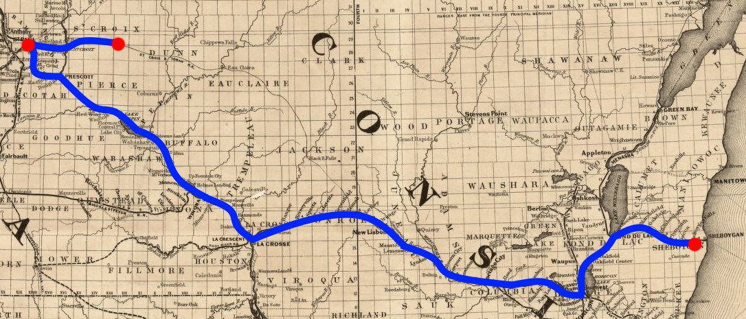 They went from Sheboygan Falls to Fond du Lac and then by train to La Crosse, where they took a boat to Prescott. There was so much ice in the river that the boat didn’t get any further than Winona, so they took a train from there. They didn’t know that the train went directly through Prescott, so they went on to St. Paul, Minnesota. The Milwaukee and St. Paul Railway was the only one in Minnesota at the time, extending only to St. Paul. There was a small, poorly built depot near the Wabasha Bridge, and a five-cent toll was collected to cross the bridge. This was in the year 1869, and St. Paul had a population of only eight thousand. They spent the night in St. Paul in a small German hotel on Third Street.