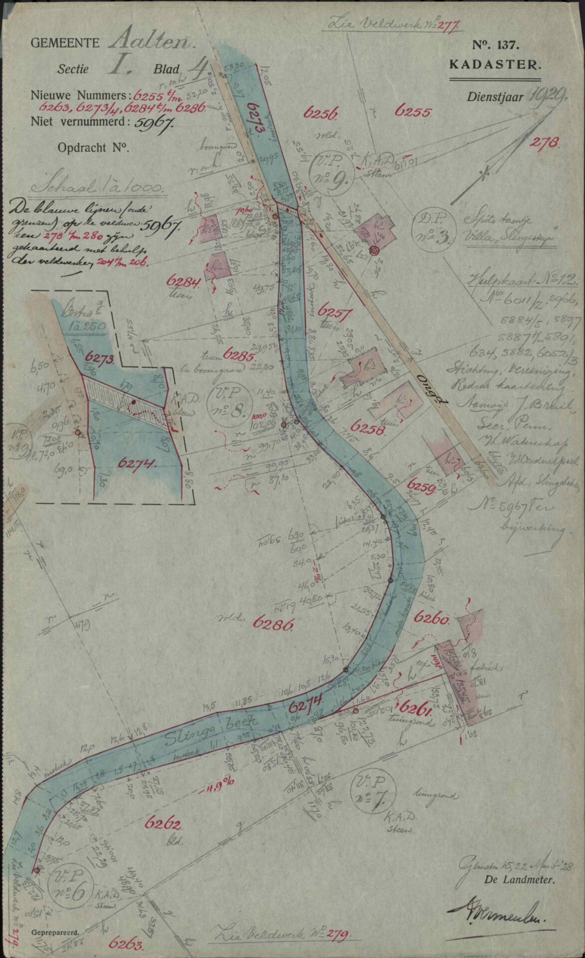 Op de foto ziet men op den voorgrond de brugbouwers in actie bij het inspuiten van den damwand voor het linker landhoofd, aan de overzijde der beek zijn de werklieden onder opzicht van de Heidemaatschappij bezig de laatste beletselen voor den nieuwen loop van de Slinge weg te graven, slechts een meter breed dammetje houdt het water nog buiten z’n nieuwe bedding.