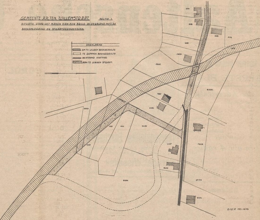 Op bovenstaand kaartje ziet men de situatie zooals deze na voltooiing van het werk zal zijn. De Willemstraat wordt verbreed en doorgetrokken over de nieuwe brug; even vóór de brug wordt een nieuwe straat aangelegd, welke tot de nieuwe bedding der beek loopt, hier komt een voetbrug over de beek, waarover de Kemena is te bereiken, terwijl de straat zich links ombuigt en de beek stroomopwaarts volgt.